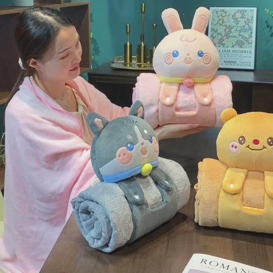 2-in-1 Hugging Pillow Blanket with Animal Plush Toy – Cuddly Comfort for Home & Travel